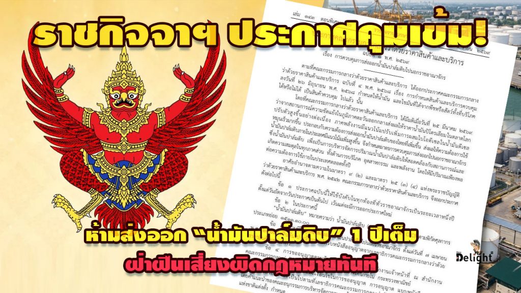 ราชกิจจาฯ ประกาศคุมเข้ม! ห้ามส่งออก “น้ำมันปาล์มดิบ” 1 ปีเต็ม ฝ่าฝืนเสี่ยงผิดกฎหมายทันที